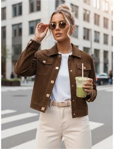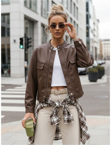 Dámská bunda v hnědé barvě zaujme elegantním vzhledem z eko kůže a zapínáním na knoflíky, které dodává celkovému designu stylový a lehce retro charakter. Nadčasové provedení se hodí jak pro každodenní nošení, tak i pro výraznější městské outfity.