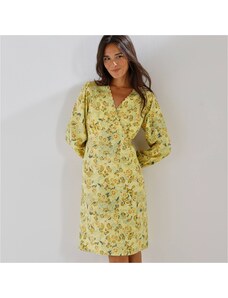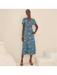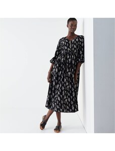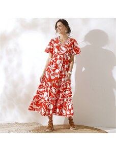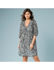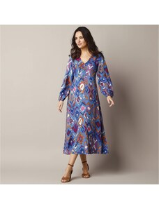 Dlhé rozšírené šaty oslnili dvojfarebnou jarnou etno potlačou a ženskými detailmi. Výstrih do V. Predný diel celozapínací. Pod prsiami prestrih a nariasenie. Vzadu v páse prestrih. Dlhé rukávy po lakte so šnúrkou na zaviazanie. Nariasené plecia. Rozšírený spodný lem. Možno prať v práčke.