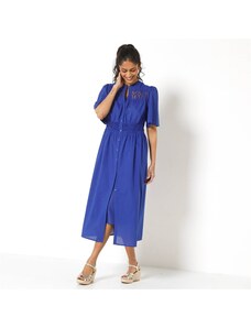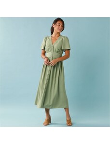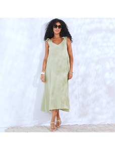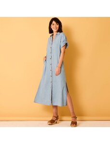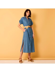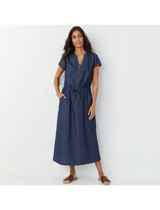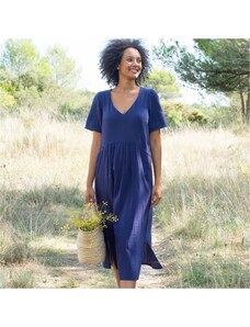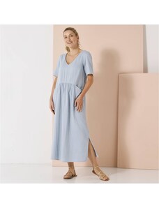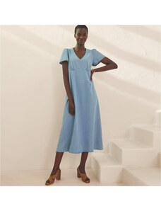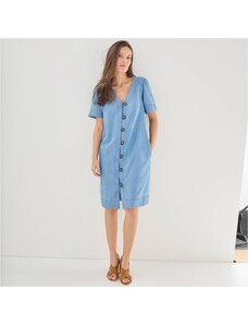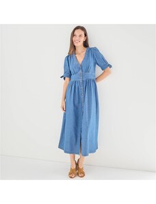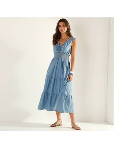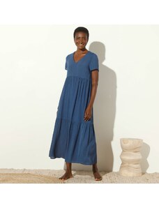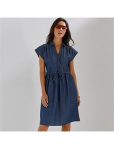 Pokiaľ hľadáte absolútne ženský kúsok, potom siahnite po dlhých džínsových šatách. Výstrih do "V". Vpredu zapínanie na gombíky. Pod prsiami prestrih a nariasenie. Vzadu v páse prestrih. Rukávy po lakte a šnúrka na zaviazanie. Nariasené plecia. Rozšírený spodný lem. Možno prať v práčke. Tento produkt je certifikovaný MADE IN GREEN od OEKO-TEX. Táto certifikácia zaručuje prísne chemické analýzy (STANDARD 100) a zodpovednú výrobu, hodnotenú podľa kontrolovaných environmentálnych a sociálnych kritérií.