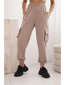 MladaModa Bavlnené teplákové nohavice s vreckami a reťazou model 7357 béžové