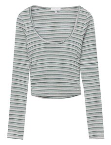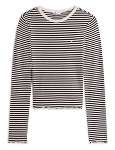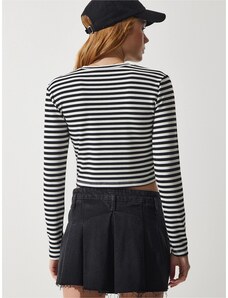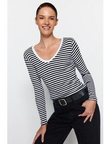 Trendyol čierna pruhovaná rebrovaná blúzka s výstrihom do V, priliehavá/jednoduchá, s dlhým rukávom, krátka, pružná, pletená.