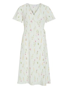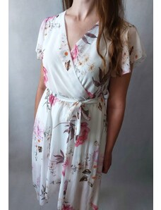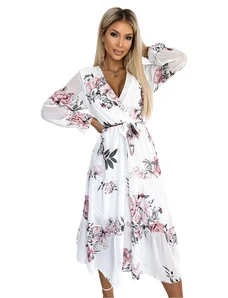 Numoco 379-6 BOYKA Priliehavé midi šaty s obálkovým výstrihom - biele s ružovými kvetmi