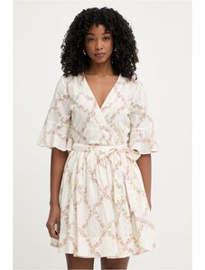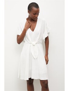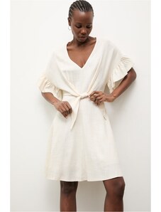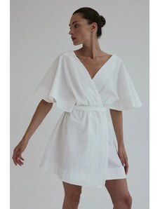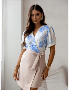 MladaModa Krátke šaty s preväzom a véčkovým výstrihom model IT-42 farba ecru