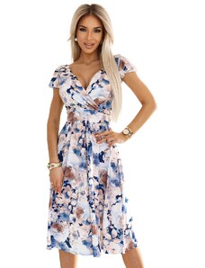 Numoco Dámske šaty s výstrihom a krátkymi rukávmi Matilde - béžové a modré kvety