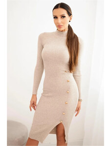 K-Fashion Dámske pletené šaty s rolákom a ozdobnými gombíkmi béžovej farby