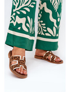 Skórzane Płaskie Klapki W Panterkę Zazoo 40383 Brązowe