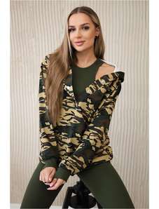 MladaModa 3-dielna súprava maskáčovej mikiny, topu a legín model 9615 farba khaki + ecru