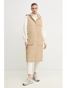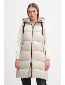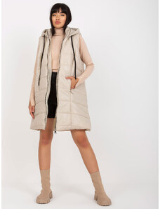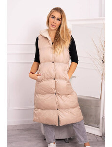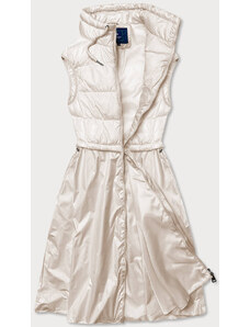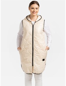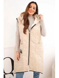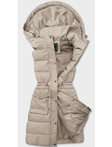 MladaModa Dlhá prešívaná páperová vesta s kapucňou model 201909 svetlá béžová