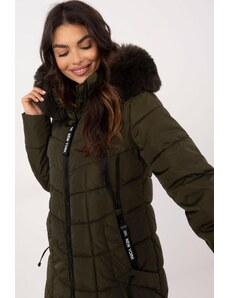 MladaModa Dlhá prešívaná zimná bunda s kapucňou a kožušinkou model 40209 farba khaki