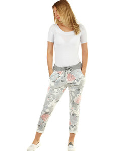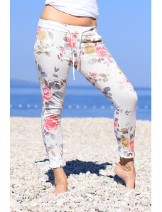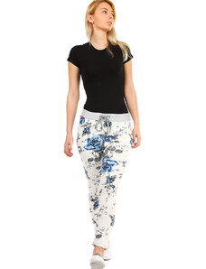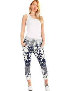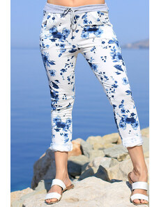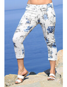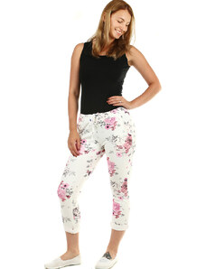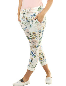 Dámske kvetinové 7/8 bavlnené nohavice skrátená dĺžka nohavíc biele s potlačou ferebných kvetín normálna výška sedu v páse všitý rebrovaný lem s pružnou gumou a šnúrka na stiahnutie 2 funkčné postranné vrecká na prednom diele silnejší pružný materiál príjemné a pohodlné nosenie ideálne pre vol'nočasové aktivity pre letné, jarné alebo teplé jesenné obdobie Modelka na fotke je 173 cm vysoká. Univerzálny rozmer zodpovedá vel'kosti M - XL. Porovnajte rozmery svojho oblečenia s našou vel'kostnou tabul'kou. Materiál : 100% bavlna Dovoz : Taliansko