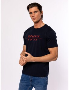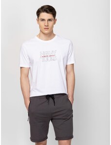Pánske tričko s krátkymi rukávmi, rovným strihom, výstrihom a veľkou potlačou značky v tóne na prednej strane. Materiál: 100% bavlna, jednoduchý džersej. Model je vysoký 188 cm a nosí veľkosť L.