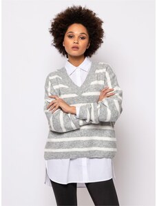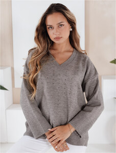 BASIC Sivý dámsky viskózový sveter VERALIA s kamienkami a výstrihom do V MY2519