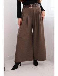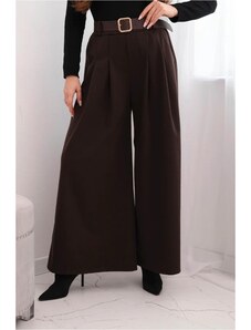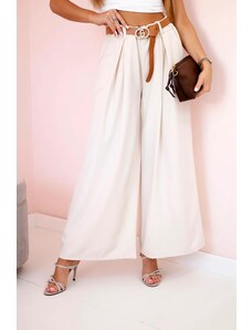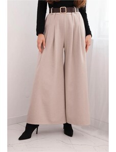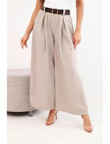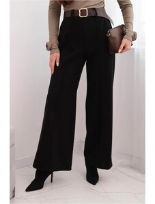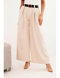 Nohavice majú vysoký pás a sú vybavené elegantným čiernym pásom s ozdobnou prackou, ktorý zvýrazňuje pás a dodáva celku štýl. Široké nohavice opticky predlžujú nohy, čo robí postavu pôsobiť ľahko a proporčne.