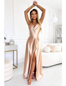 Numoco PERLA saténové dlhé šaty s exkluzívnym výstrihom na chrbte - zlaté 547-1