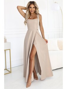 Numoco 633-1 AURELIA dlhé šaty s rozparkom a výstrihom - béžové s brokátom