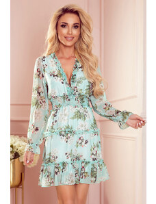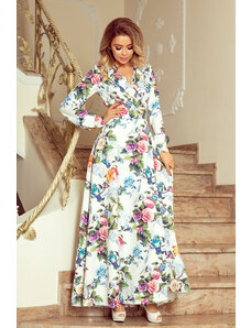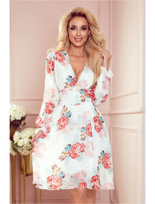 Caroline - šaty s volánmi, dvojitou sukňou a výstrihom. Ružové kvety na svetlom pozadí. Mark Numoco. Poľská produkcia.