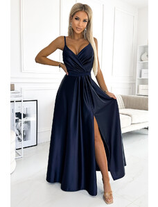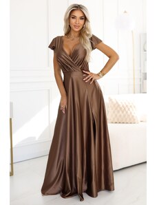 CRYSTAL - dlhé saténové maxi šaty s listovým výstrihom a rozparkom na nohavici. Farba: zlato - béžová. Šaty krásne odhaľujú dekolt a vyzerajú skvele pri tanci. Zapínanie vzadu na krytý zips. Poľský výrobok. Značka numoco . Dlhé saténové šaty s výstrihom - zlaté Rozmery sú merané na plocho - bez naťahovania materiálu (+/- 2cm)