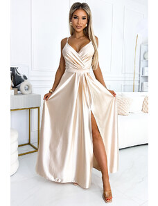 Monique – esencia elegancie a triedy. Dlhé saténové šaty v hlbokom odtieni čiernej sú kvintesenciou ženskosti. Obálkový výstrih decentne zvýrazní poprsie a vysoký rozparok na nohavici dodáva outfitu na zmyselnosti. Pás zvýraznený opaskom krásne tvaruje siluetu a vytvára jedinečný efekt. Ideálne pre večerné výlety, elegantné večierky a zvláštne príležitosti. Poľská výroba. Značka Numoco.