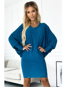Netopierie šaty s výstrihom. Vyrobené z elastického materiálu s trblietkami. Dajú sa nosiť rovno alebo zastrčené. Modrá farba. Značka Numoco . Poľská výroba. Netopierie šaty - modrá farba s trblietkami Rozmery sú merané na plocho - bez natiahnutia materiálu (+/- 2 cm)