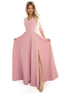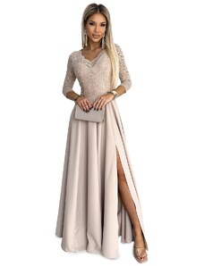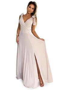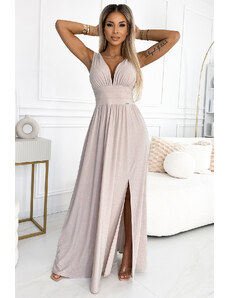 Justine - dlouhé maxi šaty s výstřihem, rozparkem na nohavicích a zavazováním vzadu. Vyrobeno z pružného materiálu. Barva: béžová se třpytkami. Zapínání vzadu na krytý zip. Polský výrobek. Značka numoco