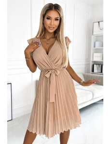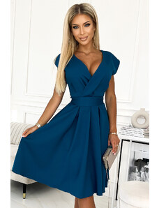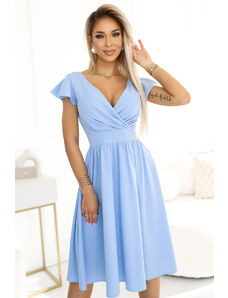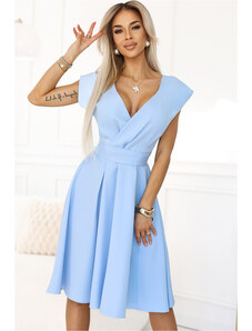 Svetlo modré rozevláté šaty s výstrihom a opaskom zvýrazňujúcim pás. Elegantný a ženský návrh pre každú príležitosť. Rozmery sú merané na plocho - bez natiahnutia materiálu (+/- 2 cm)