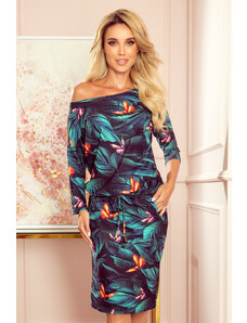Športové šaty Numoco s 3/4 rukávmi, vreckami a zaväzovaním v páse. Majú potlač v módnom vzore oranžových listov na pozadí imitujúcom džínsovinu. Sú vyrobené z pružnej tkaniny s mierne semišovou štruktúrou a poskytujú pohodlie a štýl na každodenné nosenie. Poľský výrobok.