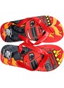 Detské letné žabky Plamienok a štvorkolky - Monster Truck Blaze - s červenými pásiky a plochou podrážkou vyrobenou z mäkkej gumy. Vrchnú časť podrážky zdobí obrázok monster trucku Blaze. Tieto žabky sú ideálne na doma k bazénu, na pláž i napríklad na dovolenku.