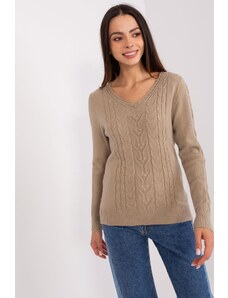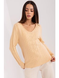 MladaModa Sveter so srdiečkovým výstrihom a vrkočovým vzorom model 32998 béžový